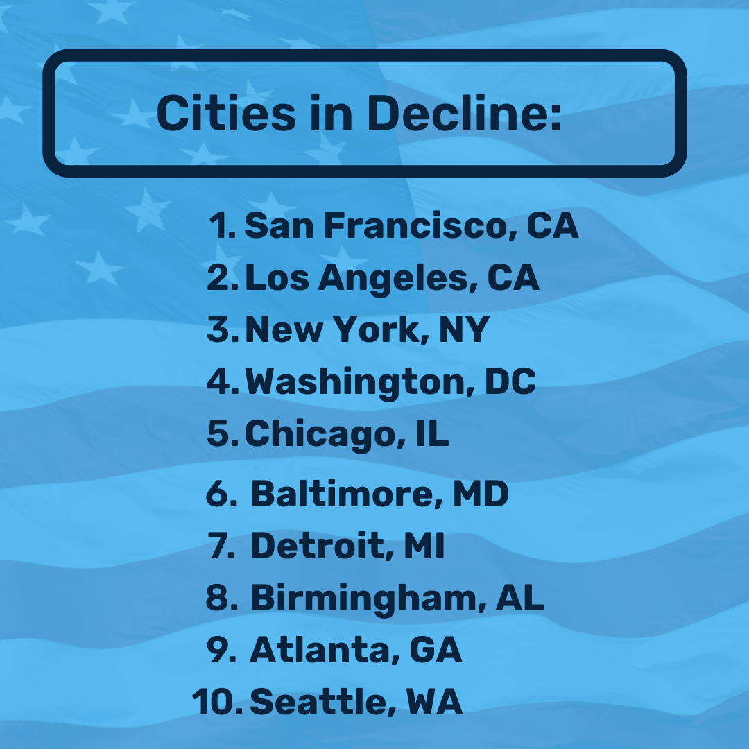 - Nashville tops the list of cities on the rise, while San Francisco tops the list of cities in decline, according to Americans.