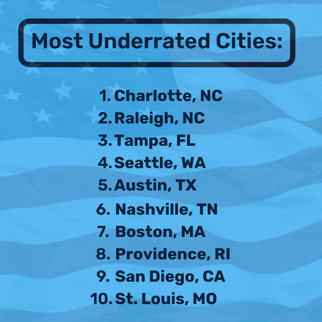 About 21% of Americans say Charlotte is the most underrated city in the United States, followed closely by Raleigh at 20%. Charlotte and Raleigh are becoming increasingly popular thanks to their strong job markets and relatively affordable cost of living. Learn more.